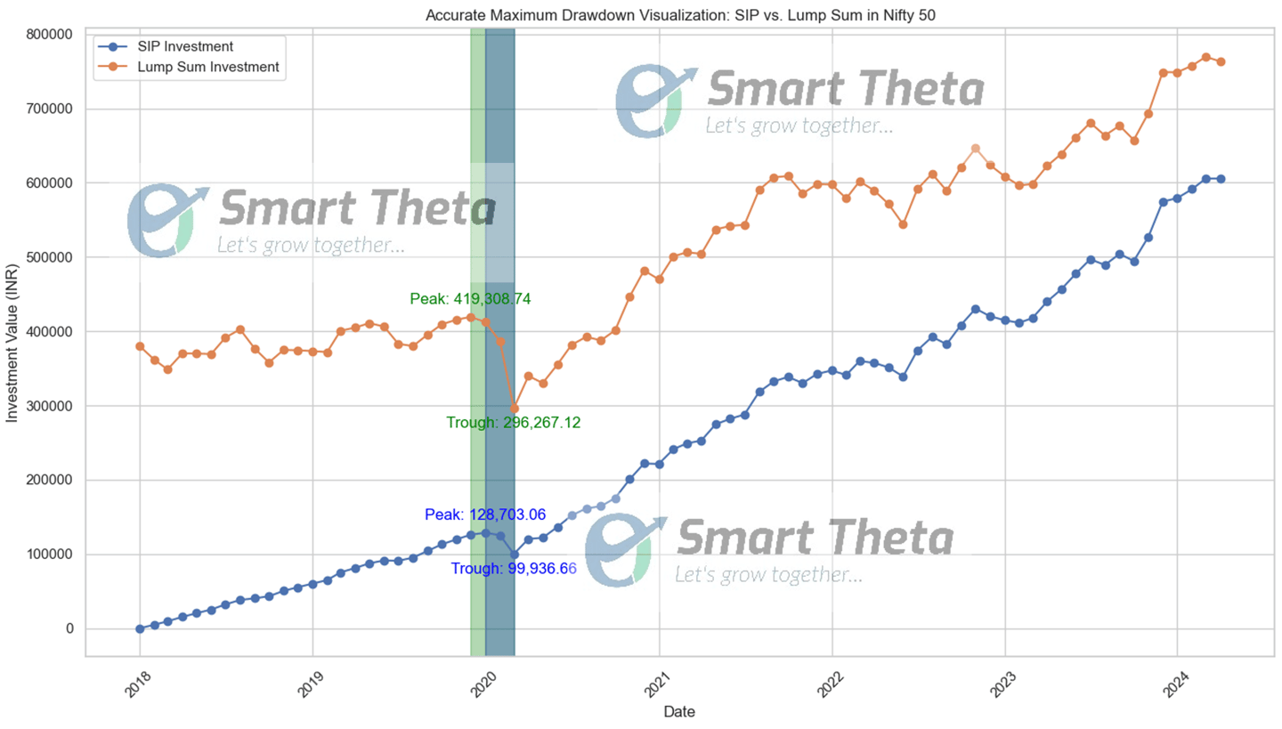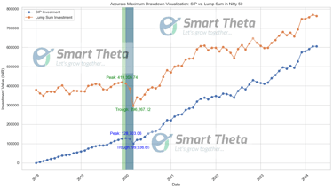 Analysis: The SIP strategy shows a lower CAGR compared to the lump sum investment but potentially offers lower volatility and maximum drawdown, indicating less risk and smaller value drops during market downturns. The lump sum investment, while providing higher returns, also poses a higher risk as indicated by a greater maximum drawdown.